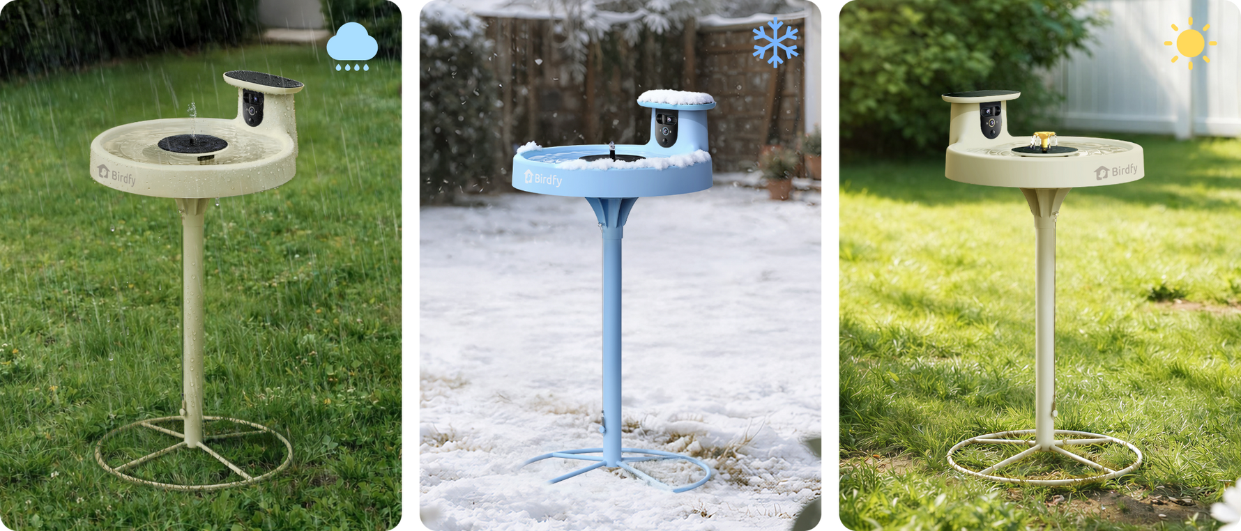 The Birdfy Bath Pro camera is designed to be weather-resistant, operating in temperatures from 14°F to 122°F (-10°C to 50°C) and featuring an IP66 waterproof rating to withstand rain. But to prevent the water from freezing, we recommend using the bath in temperatures above 32°F (0°C). We are also developing accessories, like a de-icer, to enhance your birdwatching experience in all seasons.