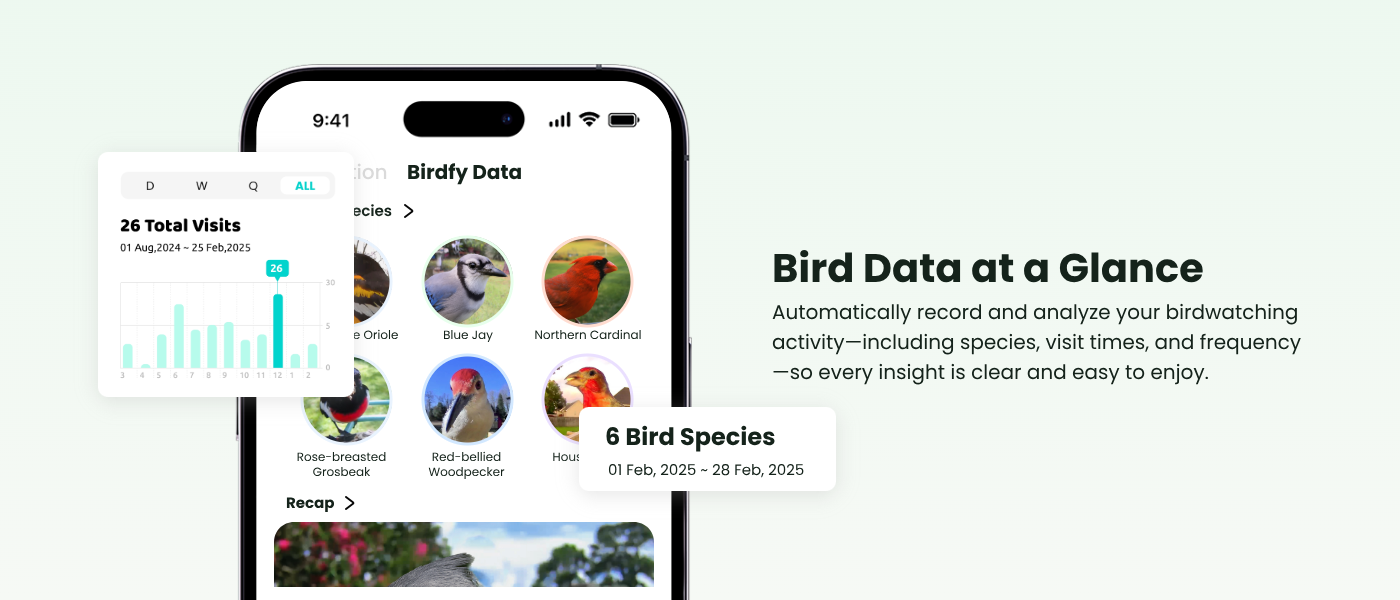 Birdfy AI recognizes every visitor and turns each visit into photos, videos, and fun insights—making birdwatching effortless and enjoyable.